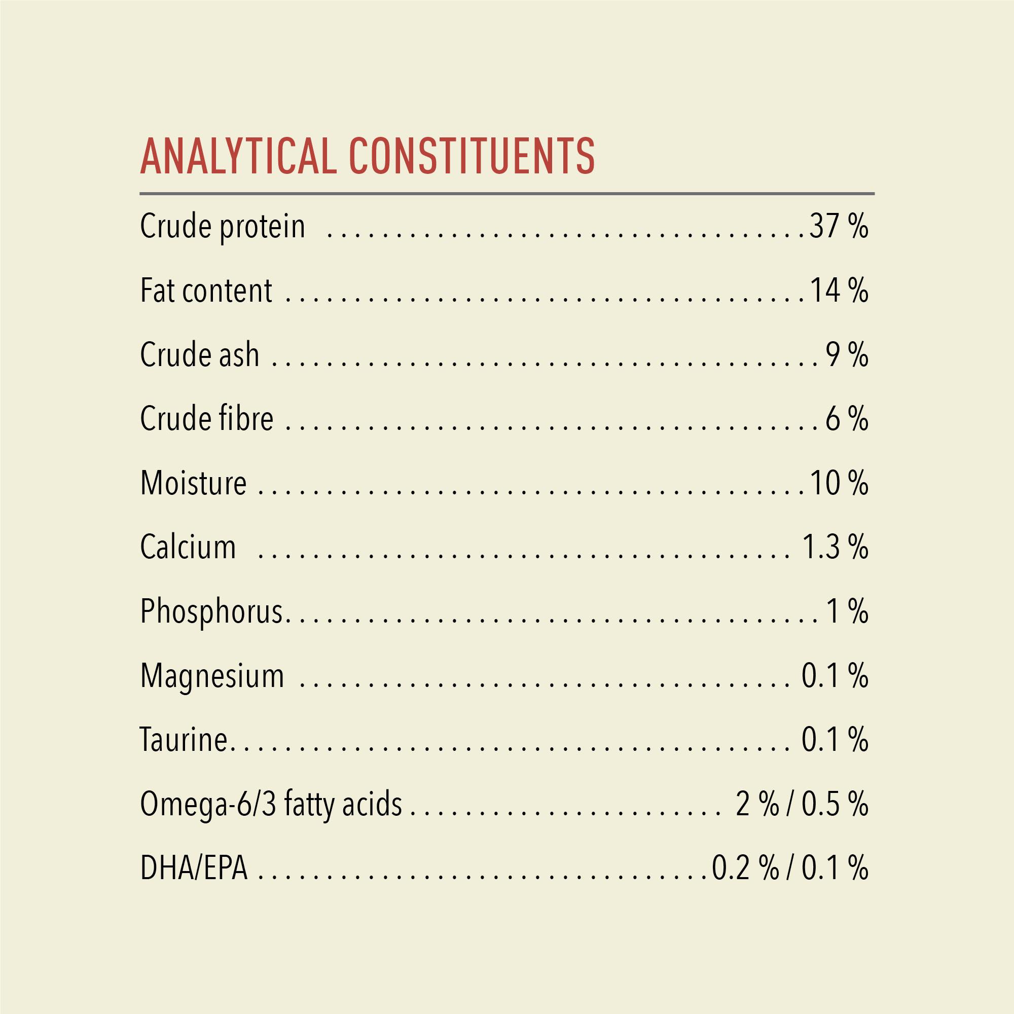 ADDITIVES (per kg): Technological additives: 1b306(i) Tocopherol extracts from vegetable oils: 121 mg, 1a330 citric acid: 40 mg. Sensory additives: Rosemary extract: 80 mg. Nutritional additives: 3a890 Choline chloride (choline): 1400 mg, 3a370 Taurine: 400 mg, 3b612 (Zinc: 120 mg), 3b407 (Copper: 11 mg),3a821 Vitamin B1: 25 mg, 3a825i Vitamin B2: 10 mg, 3a314 Niacin: 50 mg, 3a841 Calcium-D-pantothenate: 8 mg, 3a831 Vitamin B6: 7.5 mg, 3a316 Folic Acid: 0.75 mg, 3a880 Biotin: 0.25 mg, 3a835 Vitamin B12: 0.1 mg, 3a672a Vitamin A: 5625 IU, 3a671 Vitamin D3: 750 IU, 3a700 Vitamin E: 255 IU, 3c301DL-methionine: 99 mg, 3a910 L-carnitine: 75 mg. Zootechnical additives: 4b1707 Enterococcus faecium DSM 10663/NCIMB 10415: 1 x 109 CFU.